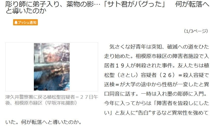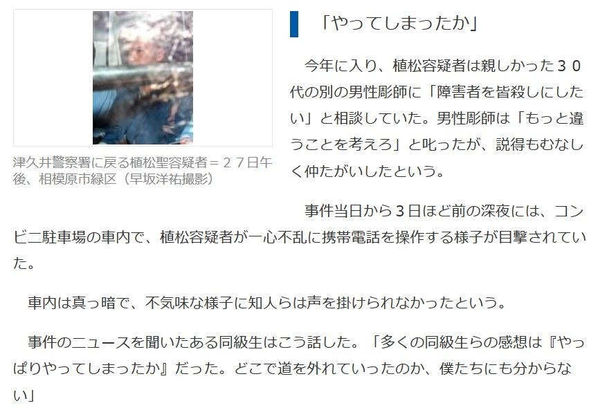 今年に入り、植松容疑者は親しかった30代の別の男性彫師に「障害者を皆殺しにしたい」と相談していた。男性彫師は「もっと違うことを考えろ」と叱ったが、説得もむなしく仲たがいしたという。