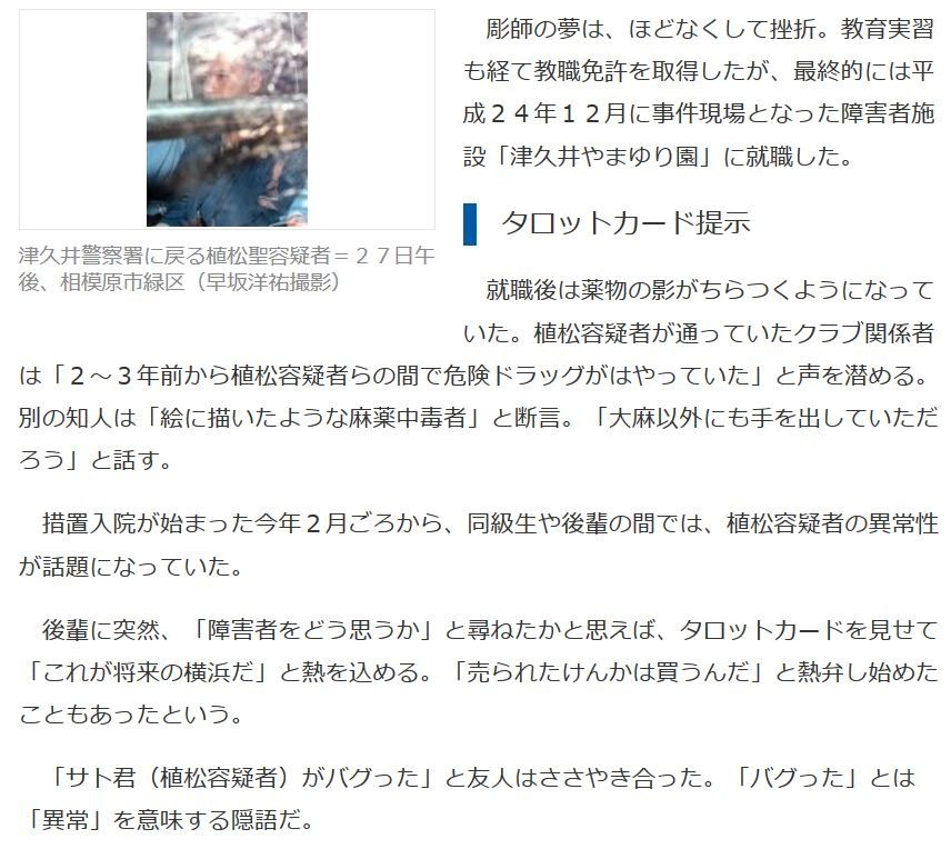 「サト君(植松容疑者)がバグった」と友人はささやき合った。「バグった」とは「異常」を意味する隠語だ。