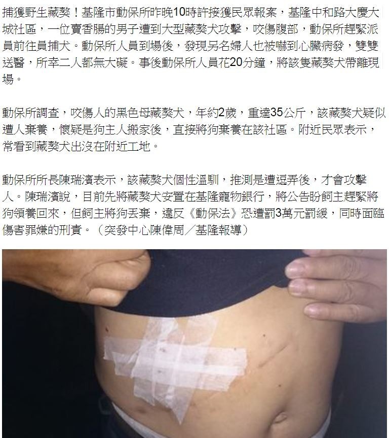 捕獲野生藏獒!基隆市動保所昨晚10時許接獲民眾報案,基隆中和路大慶大城社區,一位賣香腸的男子遭到大型藏獒犬攻擊,咬傷腹部,動保所趕緊派員前往員捕犬。動保所人員到場後,發現另名婦人也被嚇到心臟病發,雙雙送醫,所幸二人都無大礙。事後動保所人員花20分鐘,將該隻藏獒犬帶離現場。