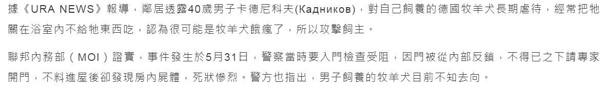 據《URA NEWS》報導,鄰居透露40歲男子卡德尼科夫(Кадников),對自己飼養的德國牧羊犬長期虐待,經常把牠關在浴室內不給牠東西吃,認為很可能是牧羊犬餓瘋了,所以攻擊飼主。