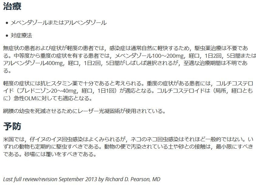 米国では,仔イヌのイヌ回虫感染はよくみられるが,ネコのネコ回虫感染はそれほど一般的ではない。いずれの動物も定期的に駆虫すべきである。動物の便で汚染されている土や砂との接触は,最小限にすべきである。砂場には覆いをすべきである。