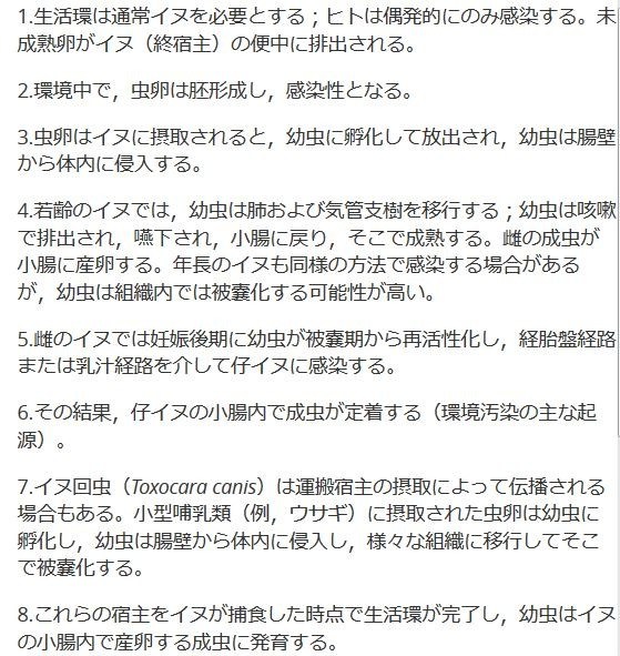 1.生活環は通常イヌを必要とする;ヒトは偶発的にのみ感染する。未成熟卵がイヌ(終宿主)の便中に排出される。