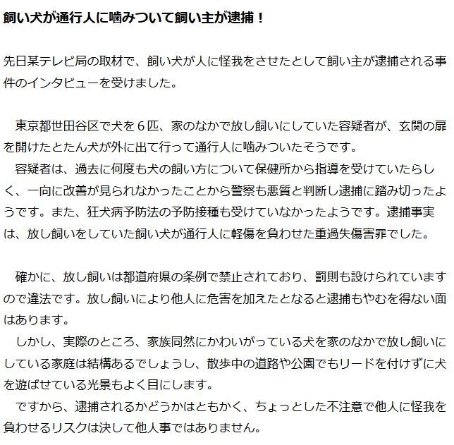 先日某テレビ局の取材で、飼い犬が人に怪我をさせたとして飼い主が逮捕される事件のインタビューを受けました。