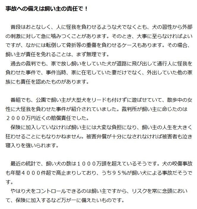 やはり犬をコントロールできるのは飼い主ですから、リスクを常に念頭において、保険に加入するなど万が一に備えたいものです。