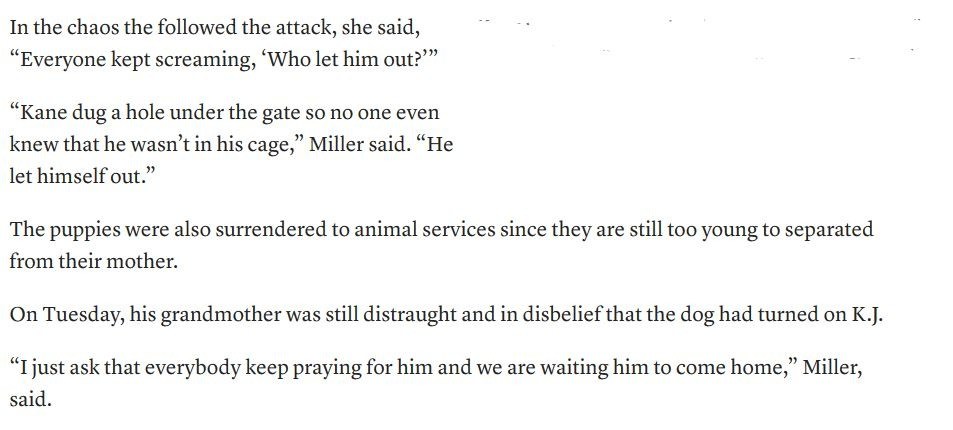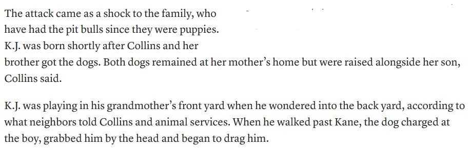 K.J. was playing in his grandmother’s front yard when he wondered into the back yard, according to what neighbors told Collins and animal services. When he walked past Kane, the dog charged at the boy, grabbed him by the head and began to drag him.