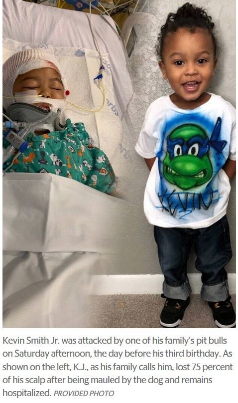 But K.J. and his family didn’t get to celebrate his birthday, because moments after his mother left he was attacked by one of the family’s pit bulls. She returned frantically to the home and was horrified to find K.J. on the ground, most of his scalp gone.