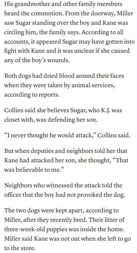 His grandmother and other family members heard the commotion. From the doorway, Miller saw Sugar standing over the boy and Kane was circling him, the family says. According to all accounts, it appeared Sugar may have gotten into fight with Kane and it was unclear if she caused any of the boy’s wounds.