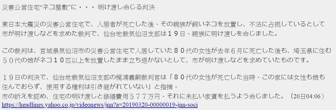 災害公営住宅“ネコ屋敷”に 明け渡し命じる判決(トキソプラズマ.弓形蟲感染症)③