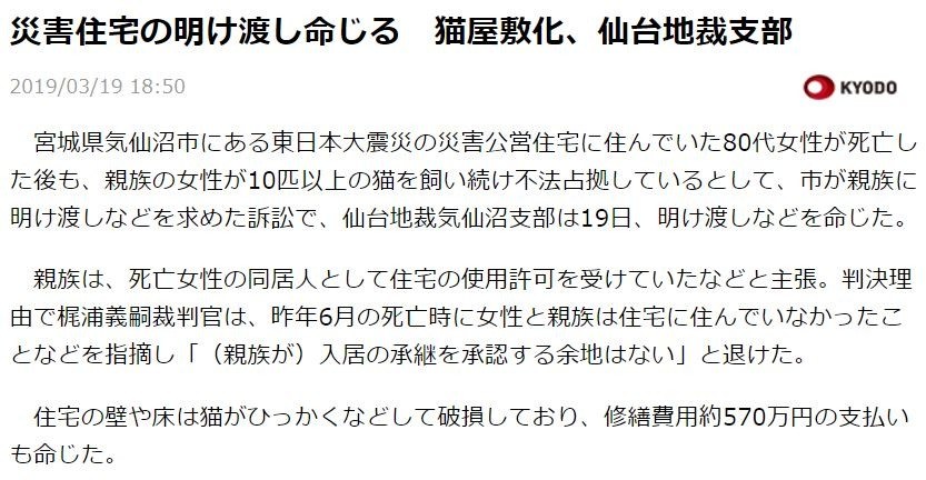 宮城県気仙沼市にある東日本大震災の災害公営住宅に住んでいた80代女性が死亡した後も、親族の女性が10匹以上の猫を飼い続け不法占拠しているとして、市が親族に明け渡しなどを求めた訴訟で、仙台地裁気仙沼支部は19日、明け渡しなどを命じた。