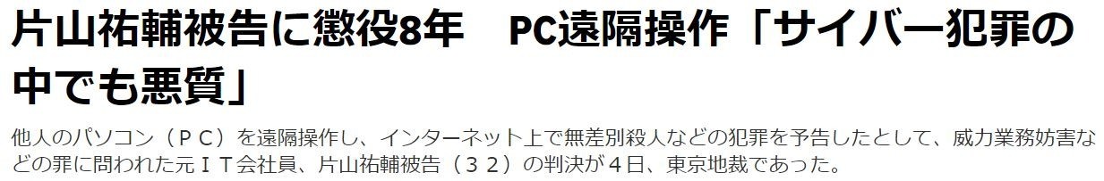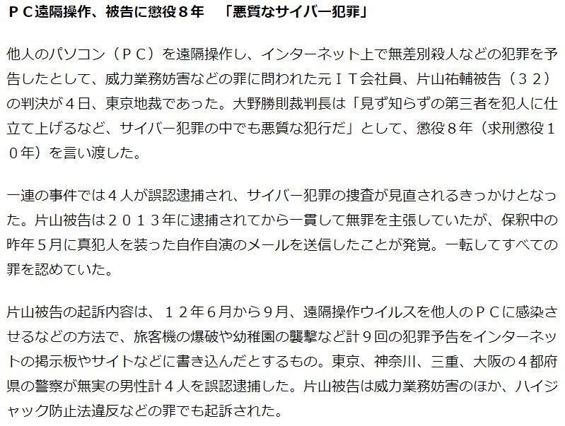 他人のパソコン(PC)を遠隔操作し、インターネット上で無差別殺人などの犯罪を予告したとして、威力業務妨害などの罪に問われた元IT会社員、片山祐輔被告(32)の判決が4日、東京地裁であった。大野勝則裁判長は「見ず知らずの第三者を犯人に仕立て上げるなど、サイバー犯罪の中でも悪質な犯行だ」として、懲役8年(求刑懲役10年)を言い渡した。