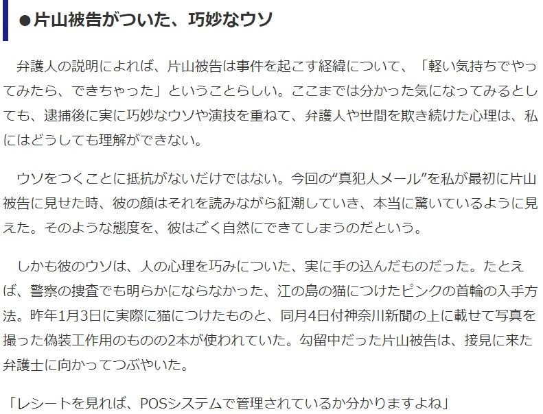 しかも彼のウソは、人の心理を巧みについた、実に手の込んだものだった。たとえば、警察の捜査でも明らかにならなかった、江の島の猫につけたピンクの首輪の入手方法。昨年1月3日に実際に猫につけたものと、同月4日付神奈川新聞の上に載せて写真を撮った偽装工作用のものの2本が使われていた。勾留中だった片山被告は、接見に来た弁護士に向かってつぶやいた。