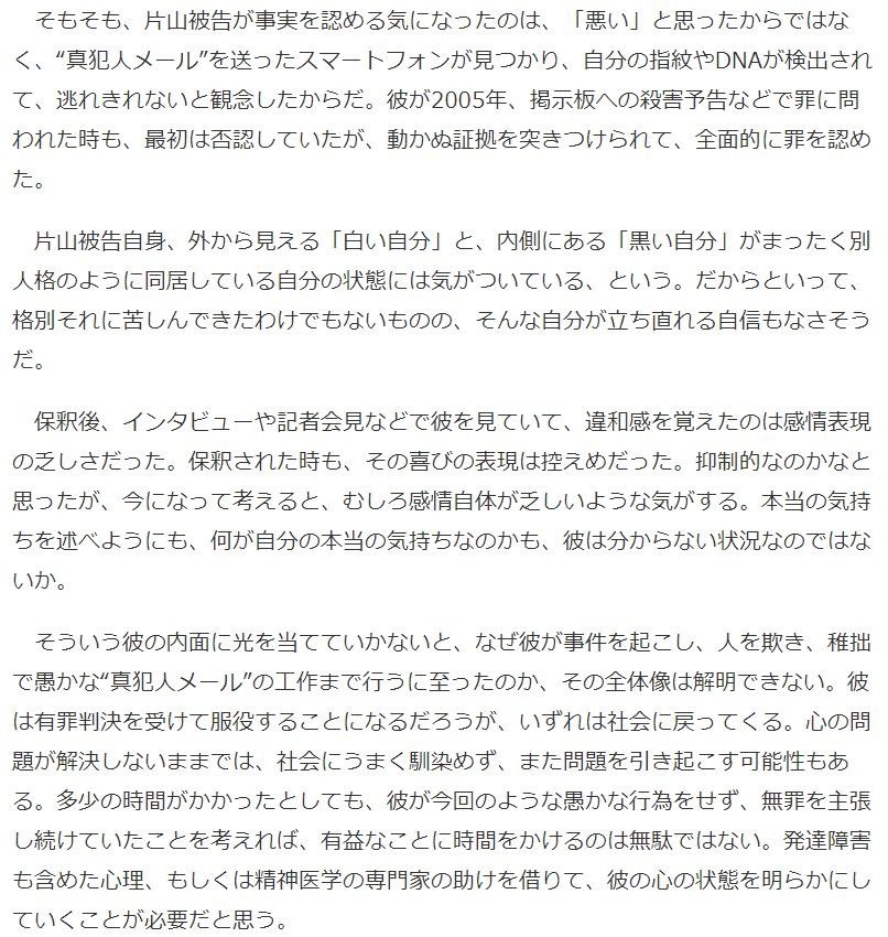 ウソをつくことに抵抗がないだけではない。今回の“真犯人メール”を私が最初に片山被告に見せた時、彼の顔はそれを読みながら紅潮していき、本当に驚いているように見えた。そのような態度を、彼はごく自然にできてしまうのだという。