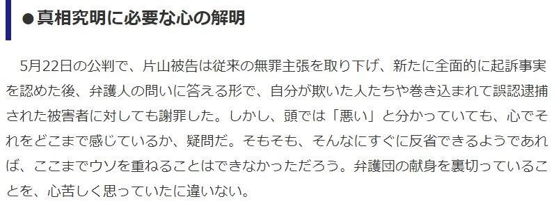 弁護団は、片山被告の無実を信じて、実に献身的な弁護活動を行っていた。主任弁護人は、片山被告の母親を元気づけようと、2人を事務所旅行に招待した。そういう人たちを欺くことに、彼はなんら心の痛みを感じていなかったようだ。あたかも、そのような痛みを感じる回路のどこか大事な部分が、すっぽり抜け落ちているように思える。自身の行為によって誤認逮捕され、虚偽の自白にまで追い込まれた人たちの苦しみに対しても、リアルに想像することができないでいるのだろう。