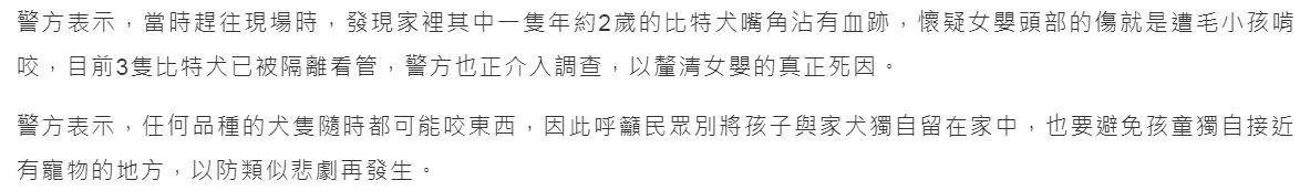 警方表示,任何品種的犬隻隨時都可能咬東西,因此呼籲民眾別將孩子與家犬獨自留在家中,也要避免孩童獨自接近有寵物的地方,以防類似悲劇再發生。