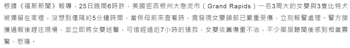 根據《福斯新聞》報導,25日晚間6時許,美國密西根州大急流市(Grand Rapids)一名3周大的女嬰與3隻比特犬被獨留在家裡,沒想到僅隔約5分鐘時間,當保母前來查看時,竟發現女嬰頭部已嚴重受傷,立刻報警處理。警方接獲通報後趕往現場,並立即將女嬰送醫,可惜經過近7小時的搶救,女嬰依舊傷重不治,不少鄰居聽聞後感到相當震驚、悲痛。