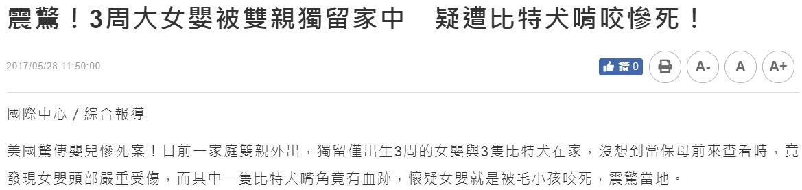 美國驚傳嬰兒慘死案!日前一家庭雙親外出,獨留僅出生3周的女嬰與3隻比特犬在家,沒想到當保母前來查看時,竟發現女嬰頭部嚴重受傷,而其中一隻比特犬嘴角竟有血跡,懷疑女嬰就是被毛小孩咬死,震驚當地。