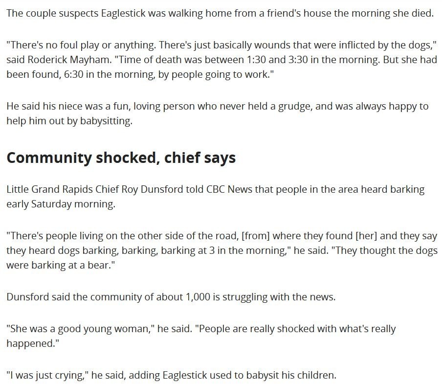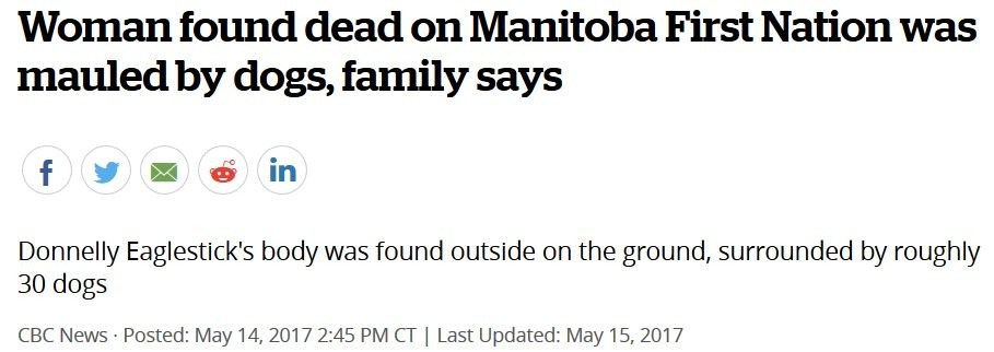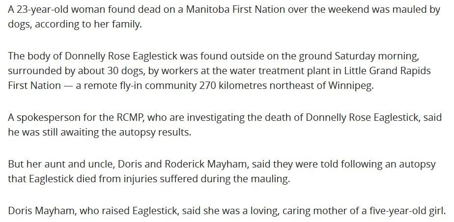 Woman found dead on Manitoba First Nation was mauled by dogs, family says(狂犬病)③