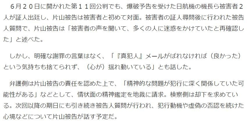 (中略)片山被告は16日の公判後の記者会見で、「私の知らない秘密の暴露があり、信ぴょう性が高い。保釈された後、私のPCは弁護人の管理下で使用しており、私はメールを送っていない。これで裁判を終わりにしてほしい」などと話した。