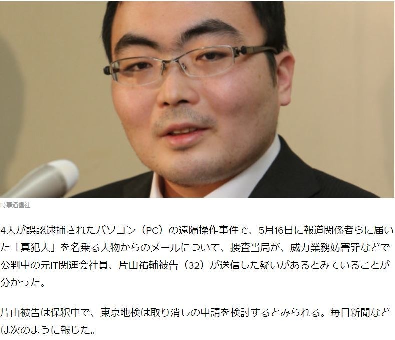 4人が誤認逮捕されたパソコン(PC)の遠隔操作事件で、5月16日に報道関係者らに届いた「真犯人」を名乗る人物からのメールについて、捜査当局が、威力業務妨害罪などで公判中の元IT関連会社員、片山祐輔被告(32)が送信した疑いがあるとみていることが分かった。