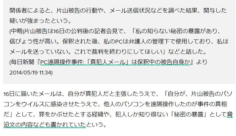 (毎日新聞『PC遠隔操作事件:「真犯人メール」は保釈中の被告自身か』より 2014/05/19 11:34)