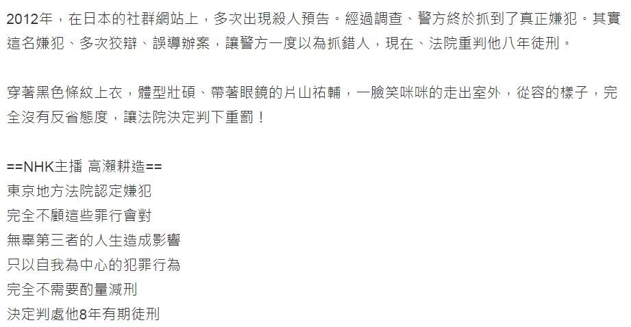 2012年,在日本的社群網站上,多次出現殺人預告。經過調查、警方終於抓到了真正嫌犯。其實這名嫌犯、多次狡辯、誤導辦案,讓警方一度以為抓錯人,現在、法院重判他八年徒刑。