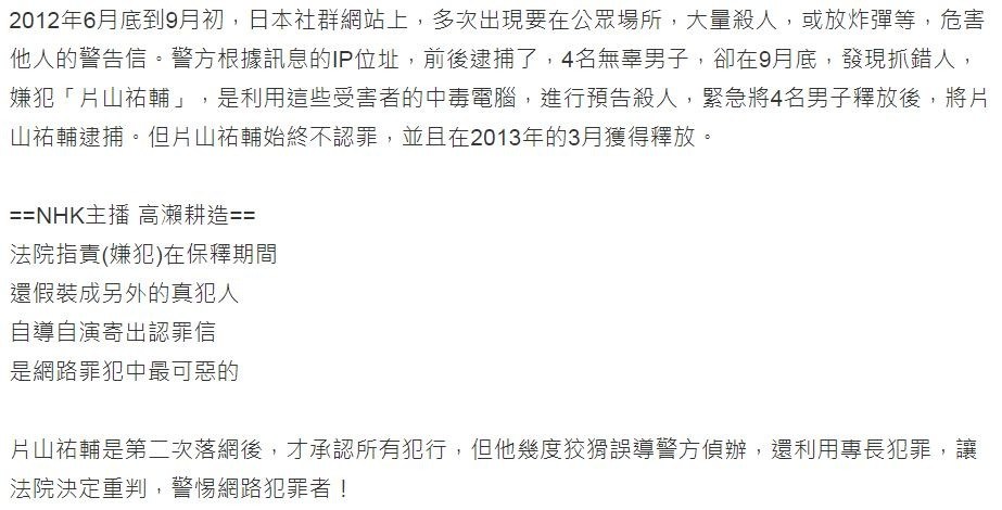 2012年6月底到9月初,日本社群網站上,多次出現要在公眾場所,大量殺人,或放炸彈等,危害他人的警告信。警方根據訊息的IP位址,前後逮捕了,4名無辜男子,卻在9月底,發現抓錯人,嫌犯「片山祐輔」,是利用這些受害者的中毒電腦,進行預告殺人,緊急將4名男子釋放後,將片山祐輔逮捕。但片山祐輔始終不認罪,並且在2013年的3月獲得釋放。