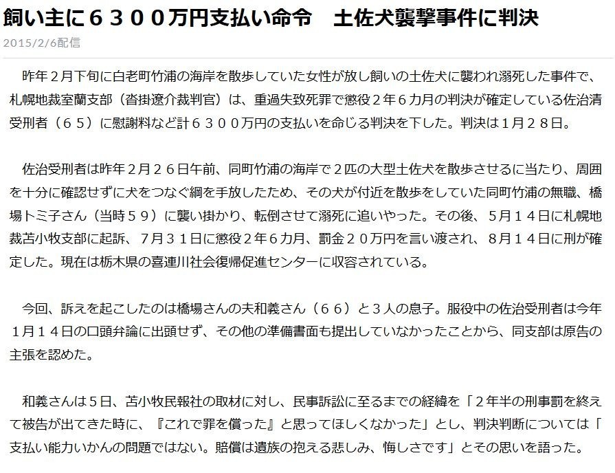 佐治受刑者は昨年2月26日午前、同町竹浦の海岸で2匹の大型土佐犬を散歩させるに当たり、周囲を十分に確認せずに犬をつなぐ綱を手放したため、その犬が付近を散歩をしていた同町竹浦の無職、橋場トミ子さん(当時59)に襲い掛かり、転倒させて溺死に追いやった。その後、5月14日に札幌地裁苫小牧支部に起訴、7月31日に懲役2年6カ月、罰金20万円を言い渡され、8月14日に刑が確定した。現在は栃木県の喜連川社会復帰促進センターに収容されている。