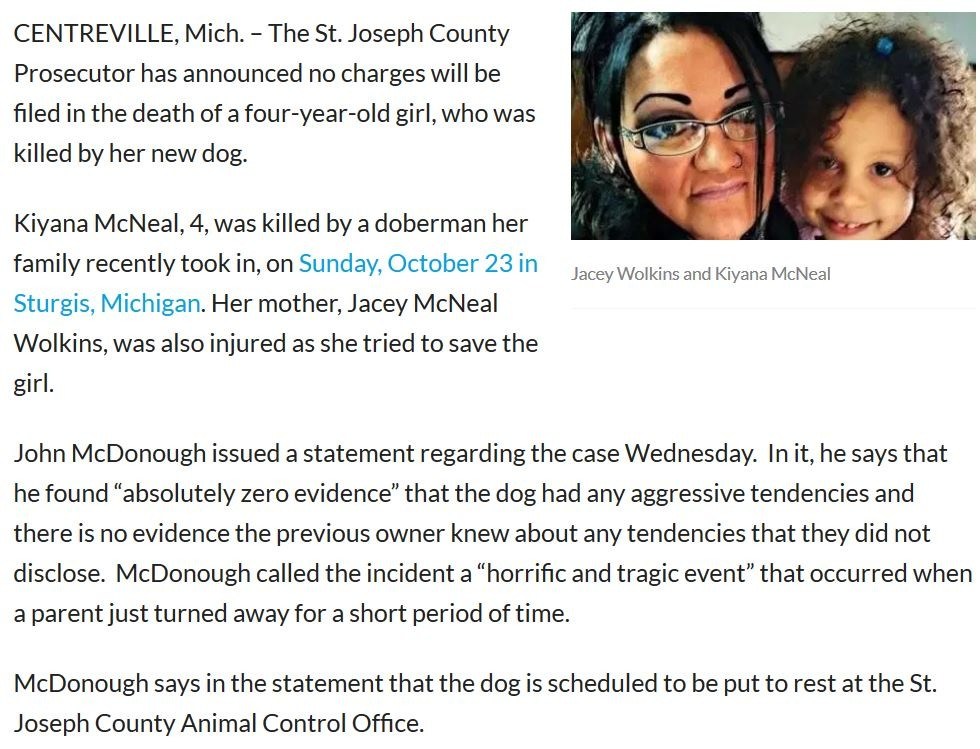 Kiyana McNeal, 4, was killed by a doberman her family recently took in, on Sunday, October 23 in Sturgis, Michigan. Her mother, Jacey McNeal Wolkins, was also injured as she tried to save the girl.