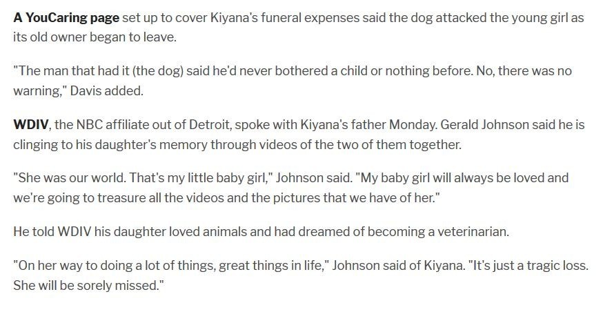 A YouCaring page set up to cover Kiyana's funeral expenses said the dog attacked the young girl as its old owner began to leave.
