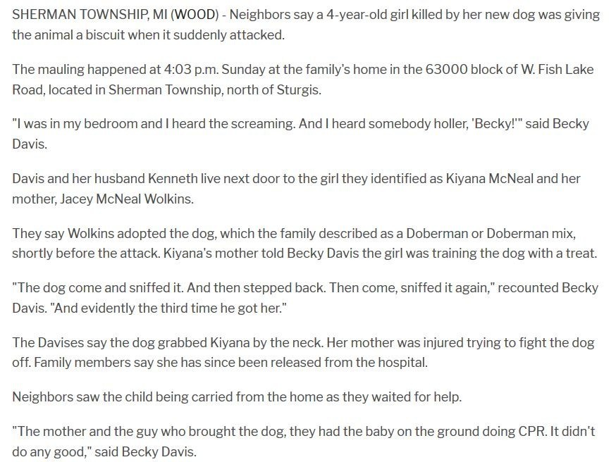 SHERMAN TOWNSHIP, MI (WOOD) - Neighbors say a 4-year-old girl killed by her new dog was giving the animal a biscuit when it suddenly attacked.