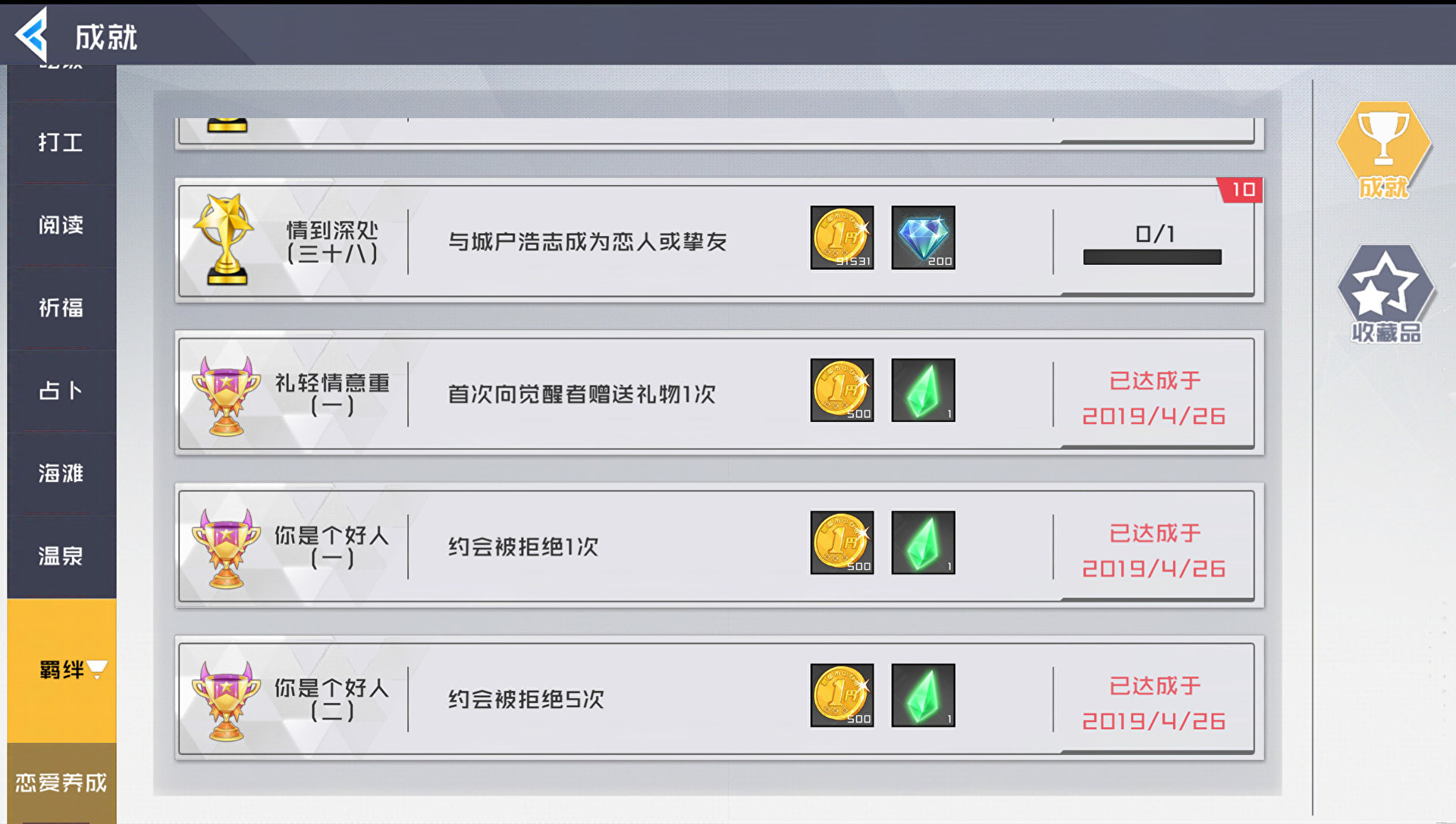 約會失敗還會有好人成就...!看來只能先靠泡溫泉和去沙灘玩提高好感度再約會了。千萬不要沒有足夠的好感度就一直約會,主角的精力會不夠,然後其他的交互玩法就沒有精力參與了...