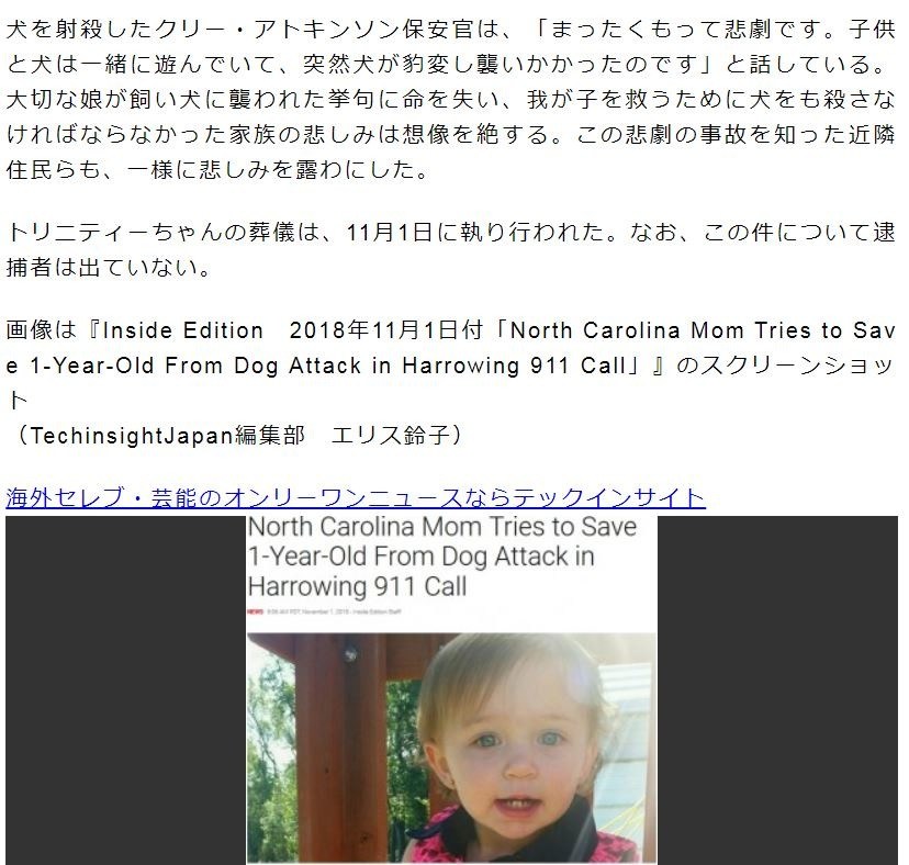 幼い娘を助けるために、ミランダさんは飼い犬を刺そうとしたが失敗。警察が駆けつけた時には、犬はトリニティーちゃんの体をまるで人形のように激しく振り回していたという。犬が噛みついたままトリニティーちゃんを離さなかったことから保安官は2発の銃を放ち、犬を射殺した。