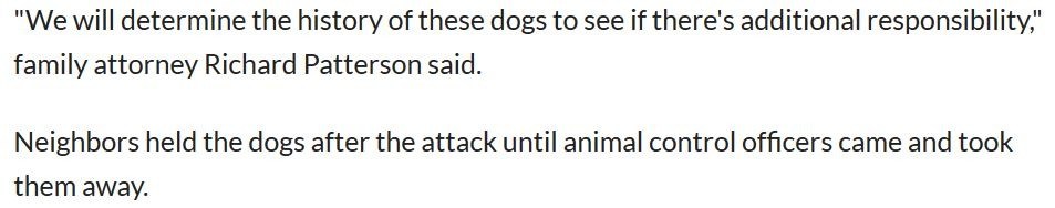 "We will determine the history of these dogs to see if there's additional responsibility," family attorney Richard Patterson said.