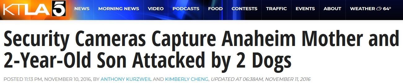https://ktla.com/2016/11/10/security-cameras-capture-anaheim-mother-and-2-year-old-son-attacked-by-2-dogs/