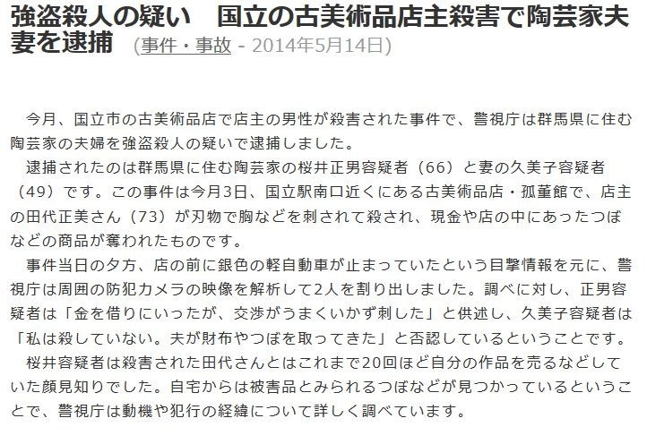 逮捕されたのは群馬県に住む陶芸家の桜井正男容疑者(66)と妻の久美子容疑者(49)です。この事件は今月3日、国立駅南口近くにある古美術品店・孤董館で、店主の田代正美さん(73)が刃物で胸などを刺されて殺され、現金や店の中にあったつぼなどの商品が奪われたものです。