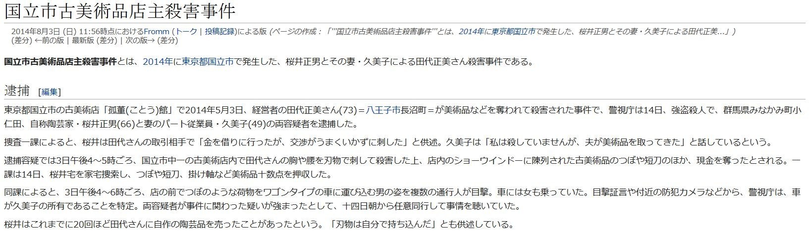 国立市古美術品店主殺害事件とは、2014年に東京都国立市で発生した、桜井正男とその妻・久美子による田代正美さん殺害事件である。