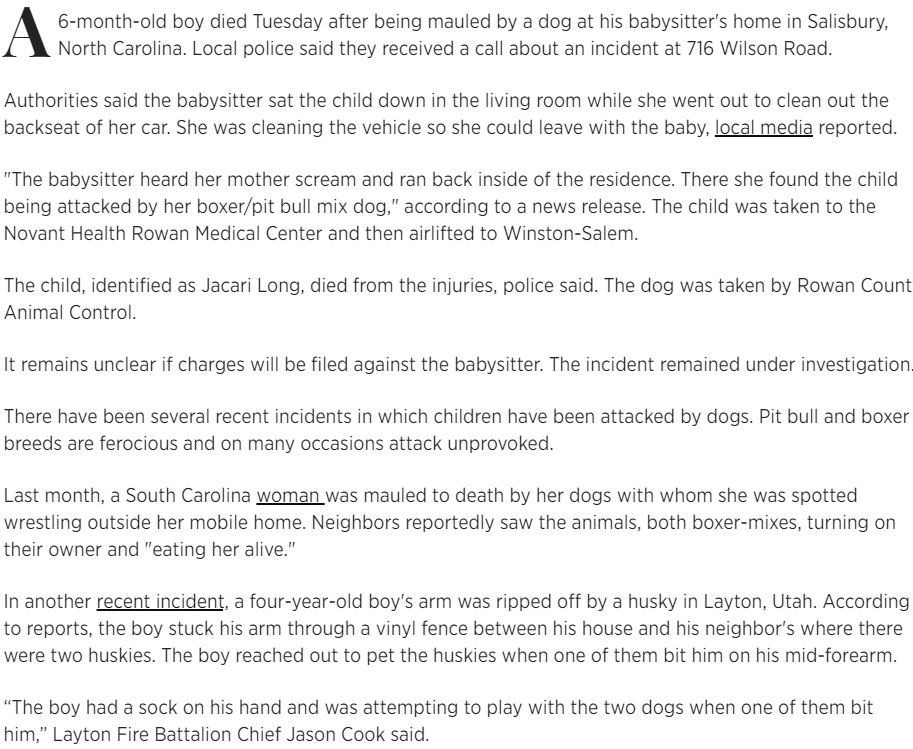 There have been several recent incidents in which children have been attacked by dogs. Pit bull and boxer breeds are ferocious and on many occasions attack unprovoked.