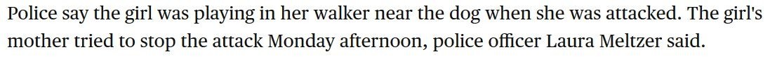Police say the girl was playing in her walker near the dog when she was attacked. The girl's mother tried to stop the attack Monday afternoon, police officer Laura Meltzer said.