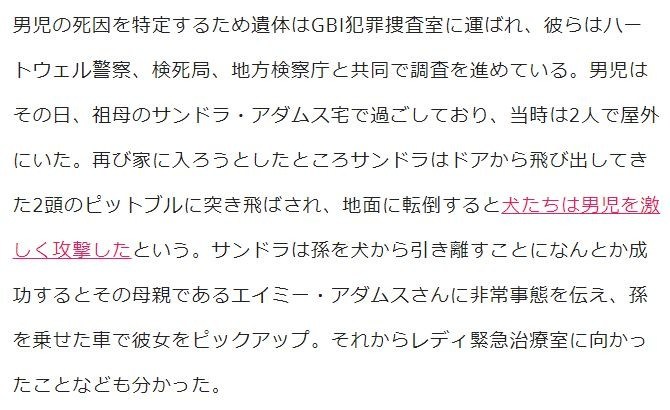 男児の死因を特定するため遺体はGBI犯罪捜査室に運ばれ、彼らはハートウェル警察、検死局、地方検察庁と共同で調査を進めている。男児はその日、祖母のサンドラ・アダムス宅で過ごしており、当時は2人で屋外にいた。再び家に入ろうとしたところサンドラはドアから飛び出してきた2頭のピットブルに突き飛ばされ、地面に転倒すると犬たちは男児を激しく攻撃したという。サンドラは孫を犬から引き離すことになんとか成功するとその母親であるエイミー・アダムスさんに非常事態を伝え、孫を乗せた車で彼女をピックアップ。それからレディ緊急治療室に向かったことなども分かった。
