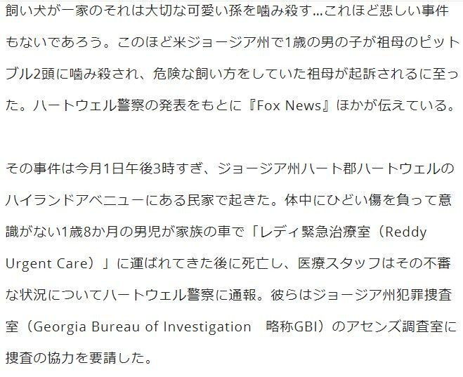 飼い犬が一家のそれは大切な可愛い孫を噛み殺す…これほど悲しい事件もないであろう。このほど米ジョージア州で1歳の男の子が祖母のピットブル2頭に噛み殺され、危険な飼い方をしていた祖母が起訴されるに至った。ハートウェル警察の発表をもとに『Fox News』ほかが伝えている。