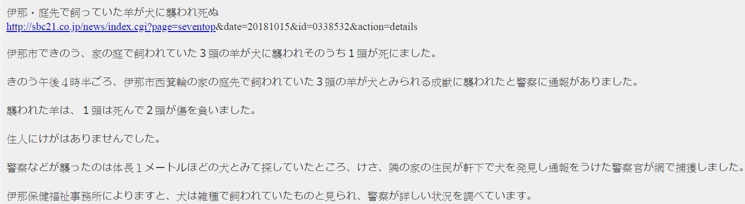 伊那・庭先で飼っていた羊が犬に襲われ死ぬ(狂犬病)①