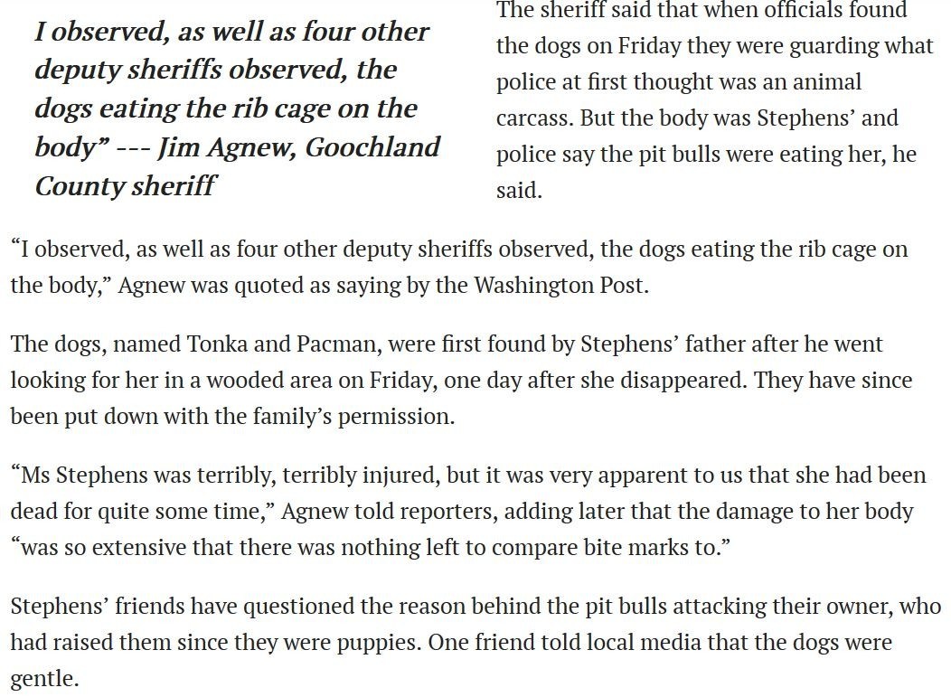 I observed, as well as four other deputy sheriffs observed, the dogs eating the rib cage on the body” --- Jim Agnew, Goochland County sheriff