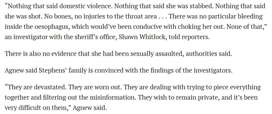 “Nothing that said domestic violence. Nothing that said she was stabbed. Nothing that said she was shot. No bones, no injuries to the throat area . . . There was no particular bleeding inside the oesophagus, which would’ve been conducive with choking her out. None of that,” an investigator with the sheriff’s office, Shawn Whitlock, told reporters.