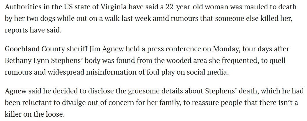 Authorities in the US state of Virginia have said a 22-year-old woman was mauled to death by her two dogs while out on a walk last week amid rumours that someone else killed her, reports have said.
