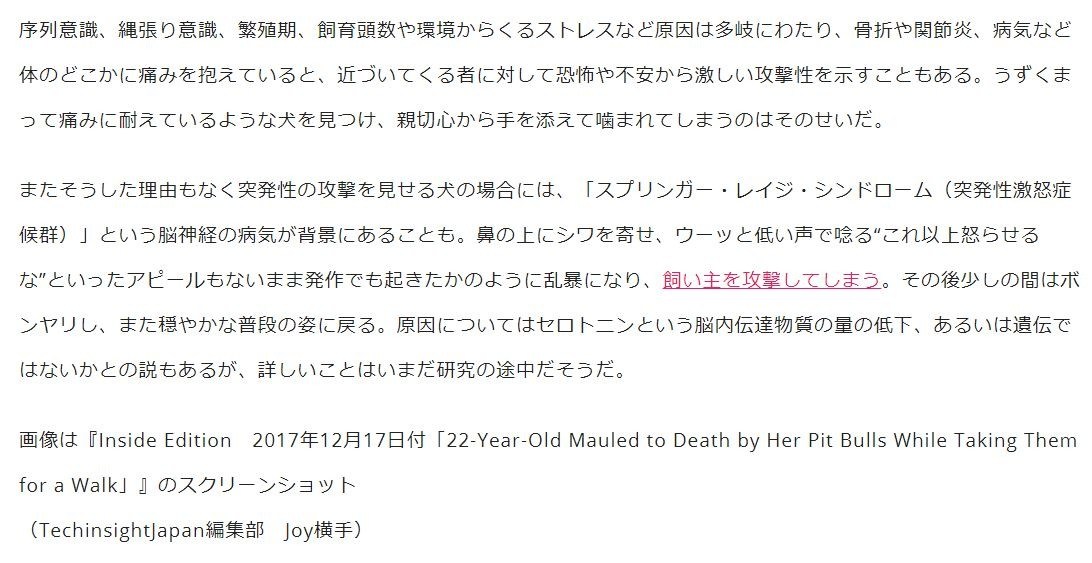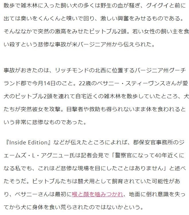 散歩で雑木林に入った飼い犬の多くは野生の血が騒ぎ、グイグイと前に出ては臭いをくんくんと嗅いで回り、激しい興奮をみせるものである。そんななかで突然の激高をみせたピットブル2頭。若い女性の飼い主を食い殺すという悲惨な事故が米バージニア州から伝えられた。