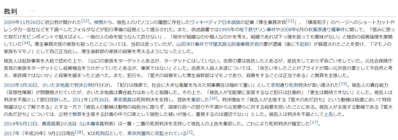 2017年(平成29年)9月22日現在[18]、Kは死刑囚として、東京拘置所に収監されている[1]。