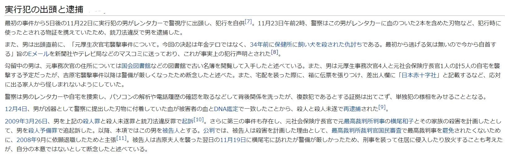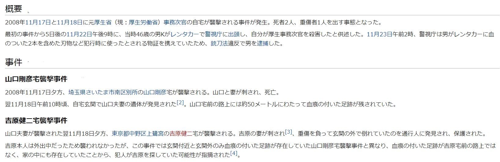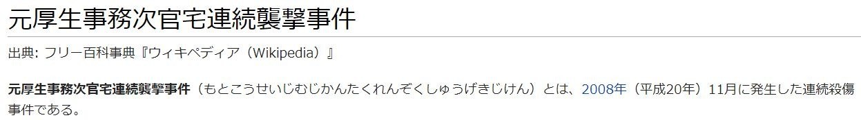 2008年11月17日と11月18日に元厚生省(現:厚生労働省)事務次官の自宅が襲撃される事件が発生。死者2人、重傷者1人を出す事態となった。