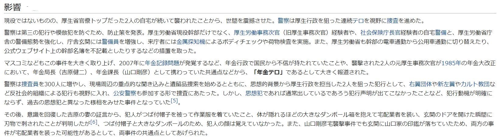 現役ではないものの、厚生省官僚トップだった2人の自宅が続いて襲われたことから、世間を震撼させた。警察は厚生行政を狙った連続テロを視野に捜査を進めた。
