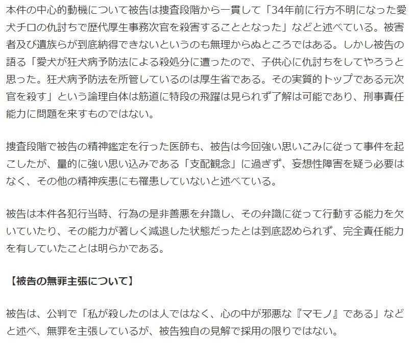 本件の中心的動機について被告は捜査段階から一貫して「34年前に行方不明になった愛犬チロの仇討ちで歴代厚生事務次官を殺害することとなった」などと述べている。被害者及び遺族らが到底納得できないというのも無理からぬところではある。しかし被告の語る「愛犬が狂犬病予防法による殺処分に遭ったので、子供心に仇討ちをしてやろうと思った。狂犬病予防法を所管しているのは厚生省である。その実質的トップである元次官を殺す」という論理自体は筋道に特段の飛躍は見られず了解は可能であり、刑事責任能力に問題を来すものではない。