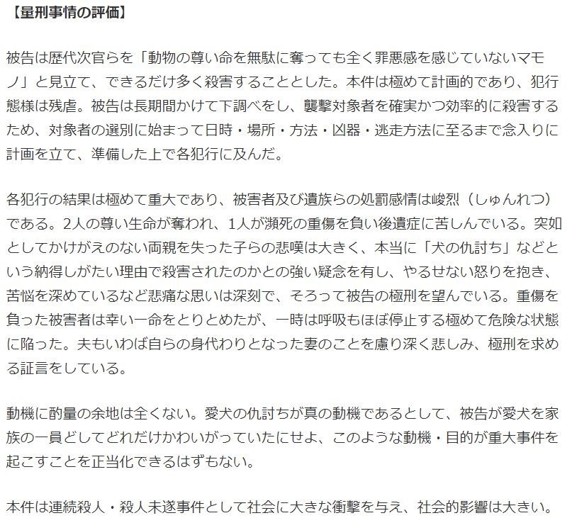 各犯行の結果は極めて重大であり、被害者及び遺族らの処罰感情は峻烈(しゅんれつ)である。2人の尊い生命が奪われ、1人が瀕死の重傷を負い後遺症に苦しんでいる。突如としてかけがえのない両親を失った子らの悲嘆は大きく、本当に「犬の仇討ち」などという納得しがたい理由で殺害されたのかとの強い疑念を有し、やるせない怒りを抱き、苦悩を深めているなど悲痛な思いは深刻で、そろって被告の極刑を望んでいる。重傷を負った被害者は幸い一命をとりとめたが、一時は呼吸もほぼ停止する極めて危険な状態に陥った。夫もいわば自らの身代わりとなった妻のことを慮り深く悲しみ、極刑を求める証言をしている。